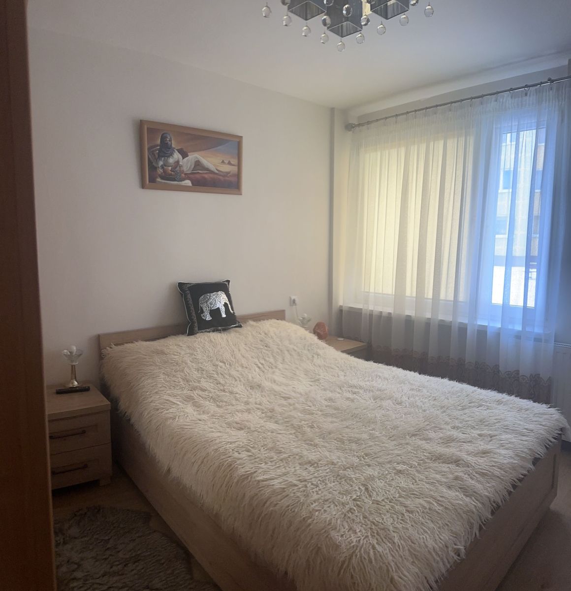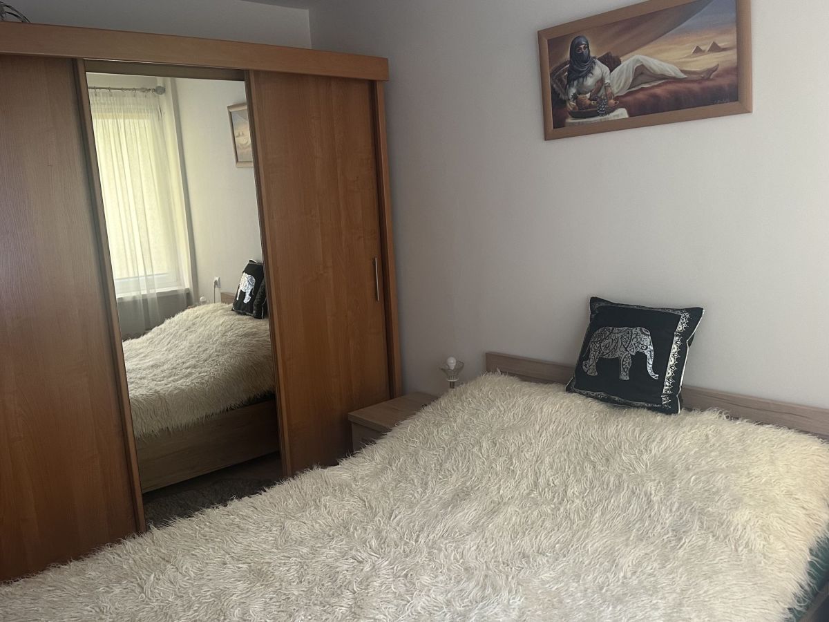 - Przytulna sypialnia z dużym łóżkiem i przestronną szafą, gwarantująca spokojny wypoczynek,